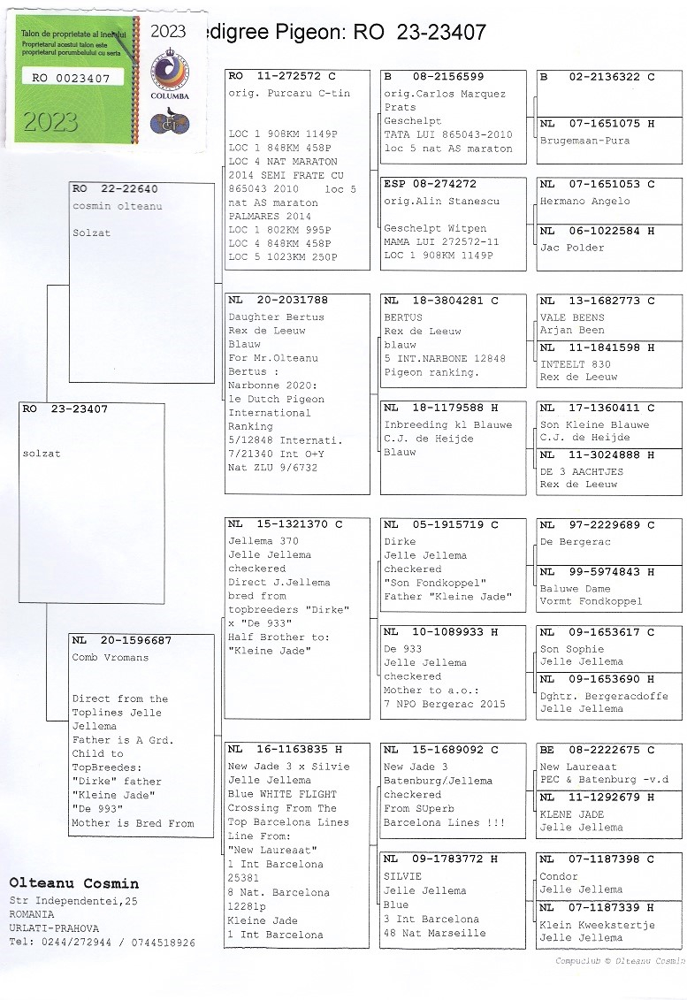 The origins of these remarkable performances are no coincidence: the champion hen descends from a Rudy Van Reeth cock and a Jos Cools hen, while the vice-champion was bred from a Jos Cools cock and the famous 484 hen, an Olympic pigeon from Olteanu’s own loft.