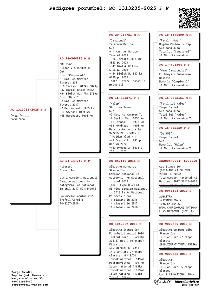 Ovidiu Dorgo’s success in marathon races is due both to the exceptional quality of the pigeons in his loft and to the intuition, passion, and dedication he brings to his work. In a region where top pigeon-racing results require hard work and great sacrifice, he stands out as a true model of perseverance, professionalism, and excellence.