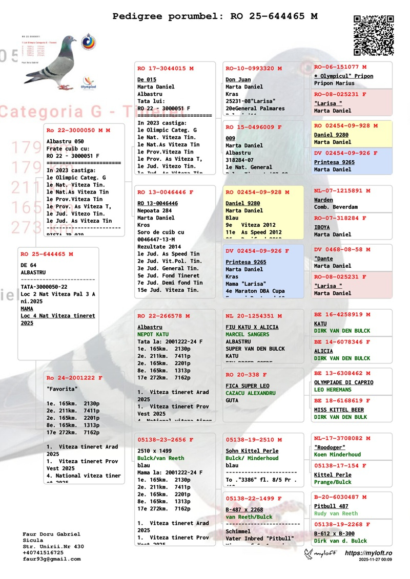 A key factor behind these achievements has been the outstanding quality of his pigeons, most of which originate from his trusted friend and mentor, Marta Daniel. Through this collaboration, Faur Gabriel was able to establish a strong breeding foundation based on elite pigeons, which proved decisive in competitions.