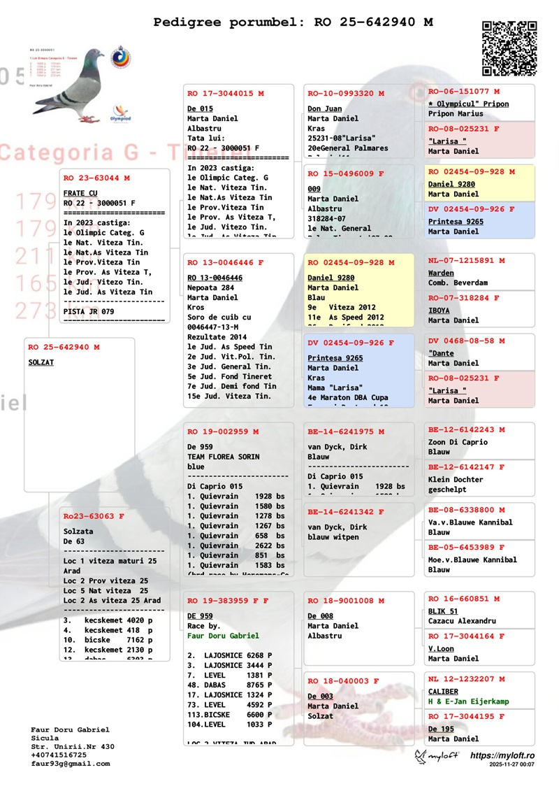 A key factor behind these achievements has been the outstanding quality of his pigeons, most of which originate from his trusted friend and mentor, Marta Daniel. Through this collaboration, Faur Gabriel was able to establish a strong breeding foundation based on elite pigeons, which proved decisive in competitions.