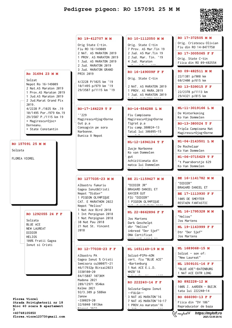 Viorel Florea, a breeder from Suceava, began competing with pigeons in 2020 within the Burdujeni Pigeon Club. He is currently a member of the Phoenix Pigeon Club - Suceava, where he competes with top-quality pigeons, sourced from renowned breeders such as the Gagea brothers, Bogdan Ciobanu, Petru Schirod, and Marius Alexa.