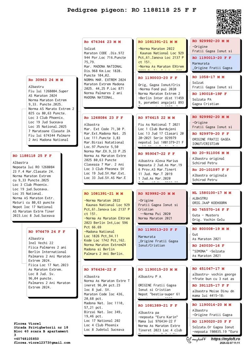 Viorel Florea, a breeder from Suceava, began competing with pigeons in 2020 within the Burdujeni Pigeon Club. He is currently a member of the Phoenix Pigeon Club - Suceava, where he competes with top-quality pigeons, sourced from renowned breeders such as the Gagea brothers, Bogdan Ciobanu, Petru Schirod, and Marius Alexa.
