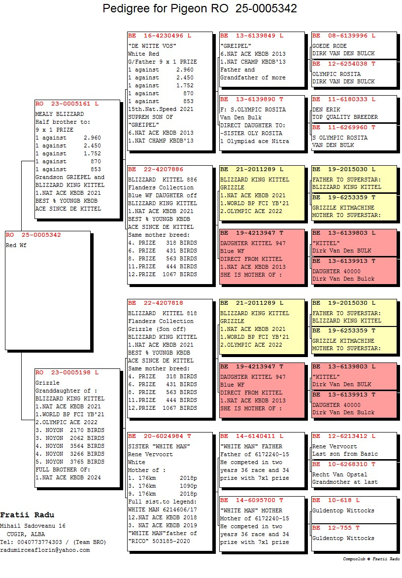 The Radu Family (Team BRO) from Cugir, Alba County, is a distinguished name in Romanian pigeon racing, recognized for their passion and impressive achievements in speed and middle-distance competitions over distances ranging from 100 to 500 kilometers. Over the years, the team has achieved outstanding results at county, provincial, and national levels, particularly excelling in competitions for young birds. In a region known for challenging flight conditions, the Radu family has demonstrated that, through dedicated work and quality pigeons, significant national achievements are within reach.