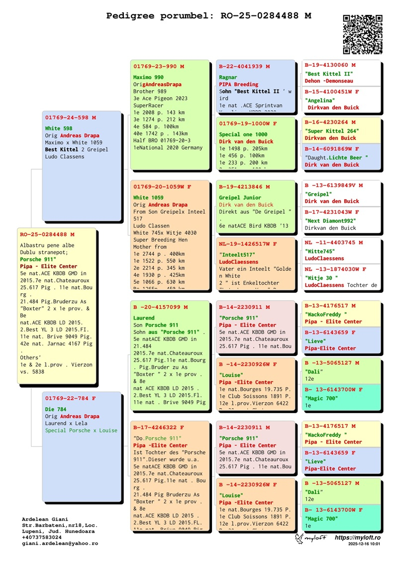 Currently, Mr. Ardelean is offering for sale a group of 12 pigeons with elite origins, destined to carry forward the tradition of success. The results achieved by fanciers who have introduced these pigeons into their lofts confirm their genetic value: