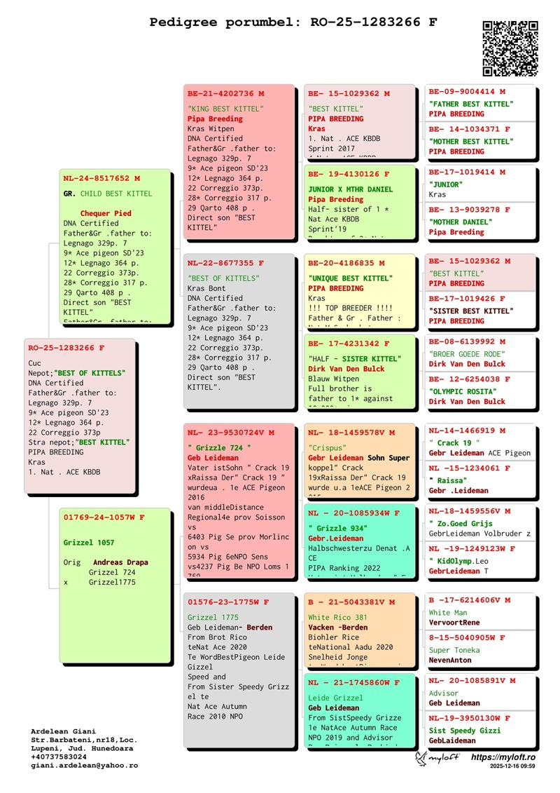 Currently, Mr. Ardelean is offering for sale a group of 12 pigeons with elite origins, destined to carry forward the tradition of success. The results achieved by fanciers who have introduced these pigeons into their lofts confirm their genetic value: