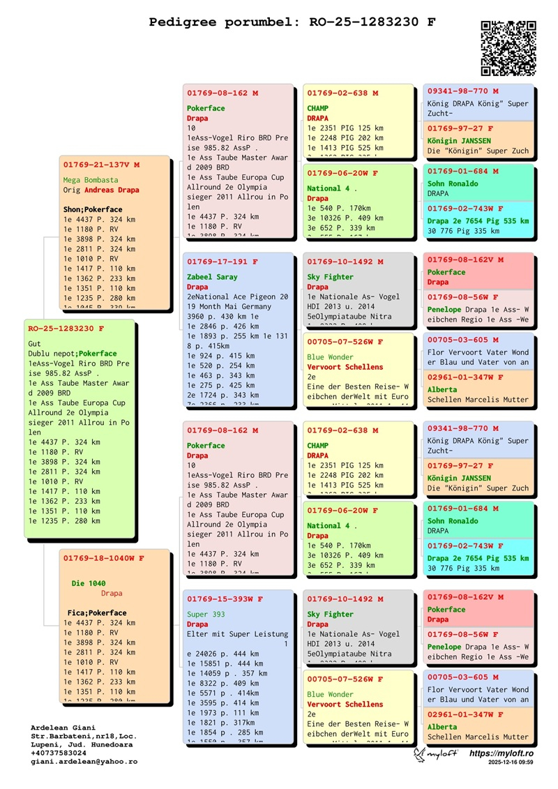 Currently, Mr. Ardelean is offering for sale a group of 12 pigeons with elite origins, destined to carry forward the tradition of success. The results achieved by fanciers who have introduced these pigeons into their lofts confirm their genetic value: