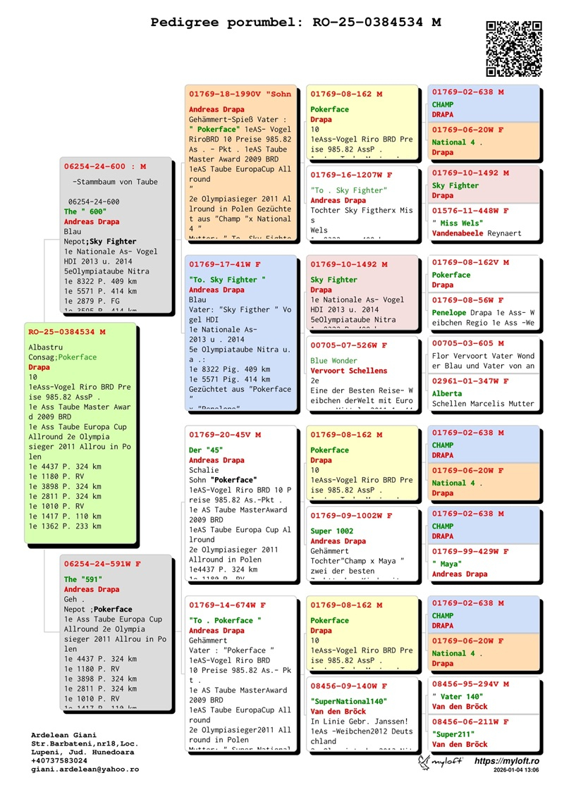 Currently, Mr. Ardelean is offering for sale a group of 12 pigeons with elite origins, destined to carry forward the tradition of success. The results achieved by fanciers who have introduced these pigeons into their lofts confirm their genetic value: