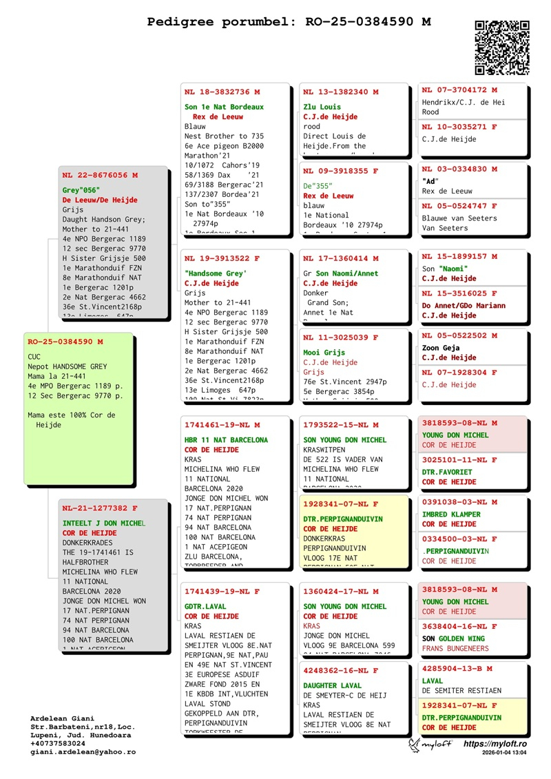 Currently, Mr. Ardelean is offering for sale a group of 12 pigeons with elite origins, destined to carry forward the tradition of success. The results achieved by fanciers who have introduced these pigeons into their lofts confirm their genetic value: