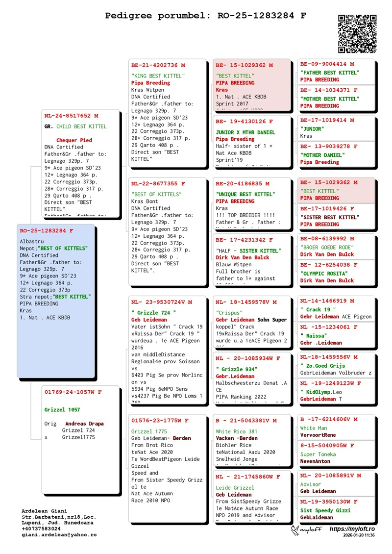 Currently, Mr. Ardelean is offering for sale a group of 12 pigeons with elite origins, destined to carry forward the tradition of success. The results achieved by fanciers who have introduced these pigeons into their lofts confirm their genetic value: