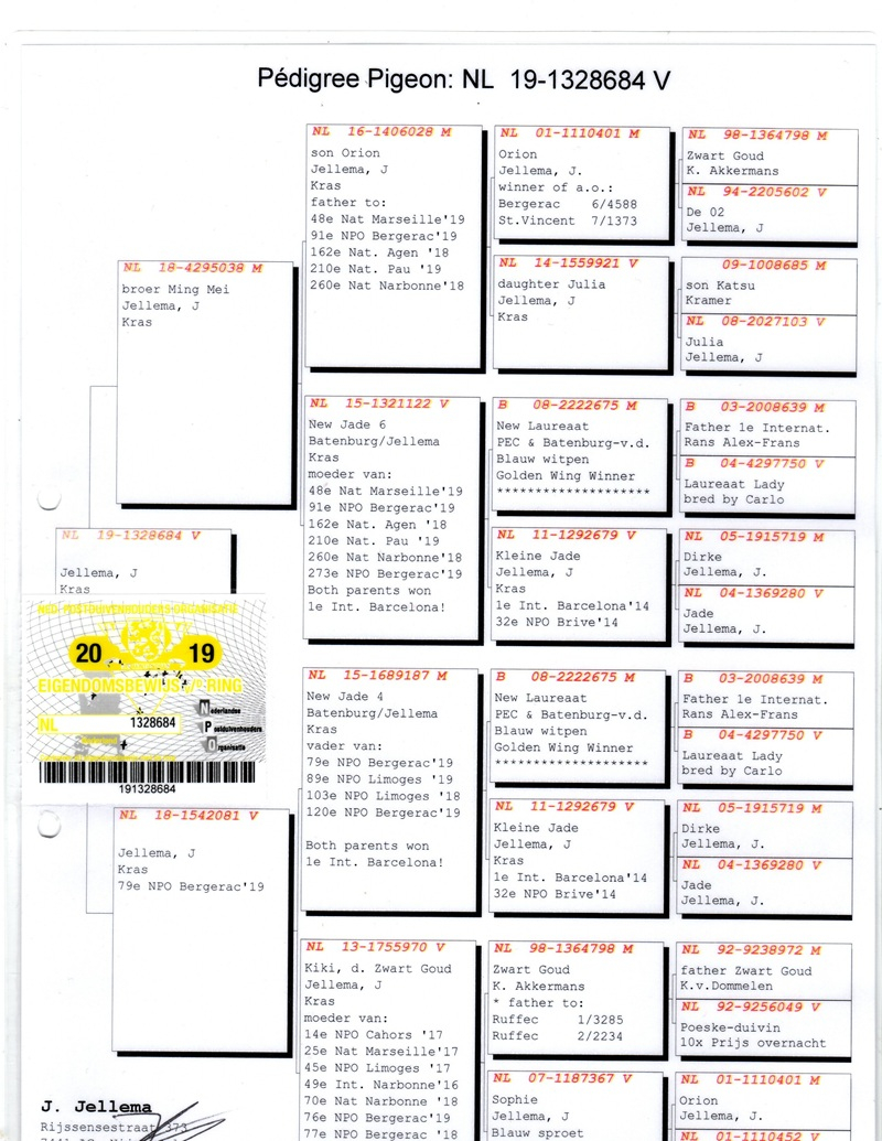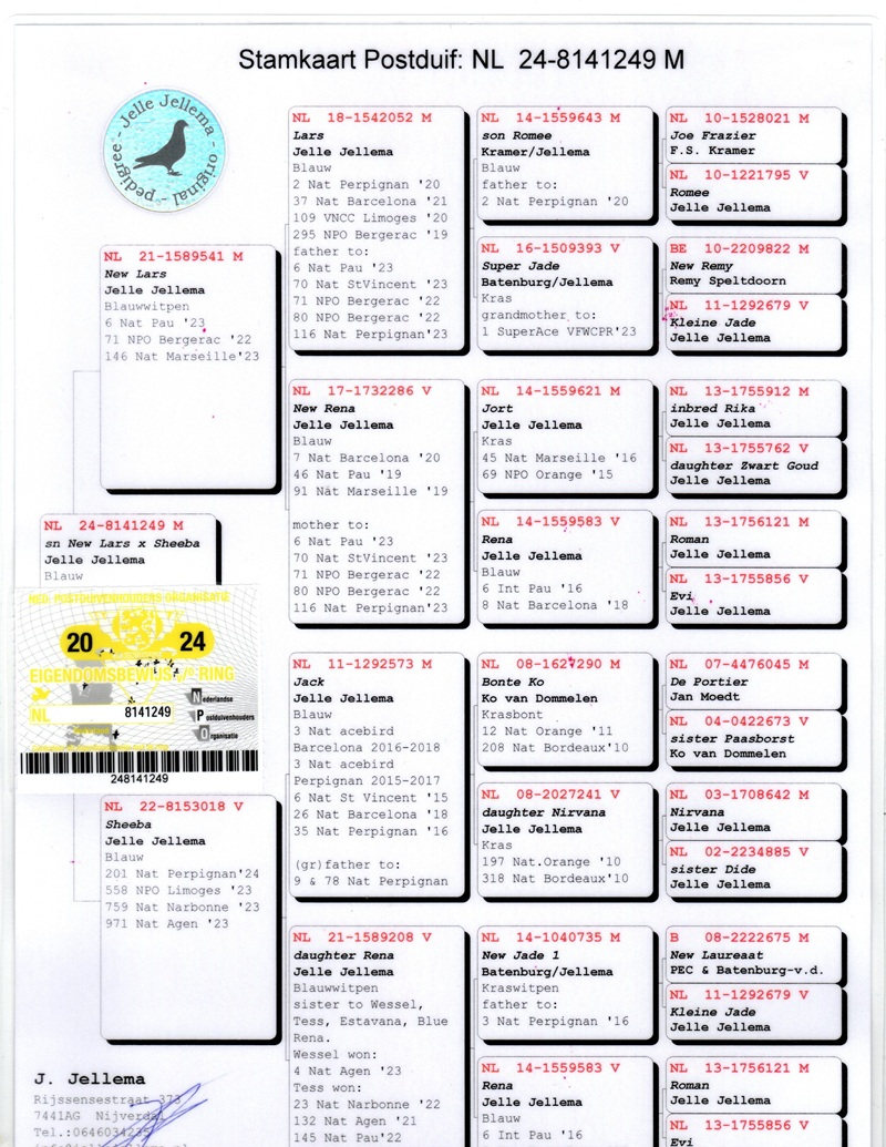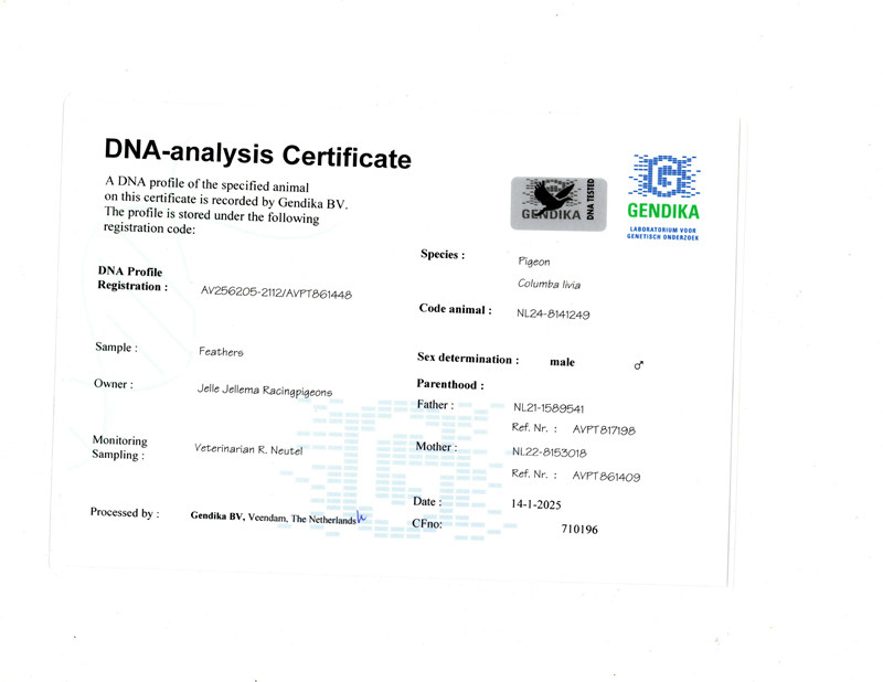 Over the years, his loft has hosted pigeons from some of the greatest marathon masters in Europe: Etienne Meirlaen, Wim Muller, Cor de Heijde, Kipp & Söhne, Jelle Jellema, Rex de Leuw, as well as originals from Andreeas Drapa, G. van Tuyl, Benno Kastelein, Gero Dijk, and Ronald Geerdink (100% Cor de Heijde). This careful selection has consolidated a strong genetic line, designed to deliver top performances in marathon, speed, middle-distance, and general categories.