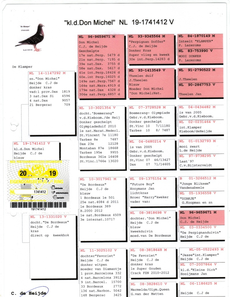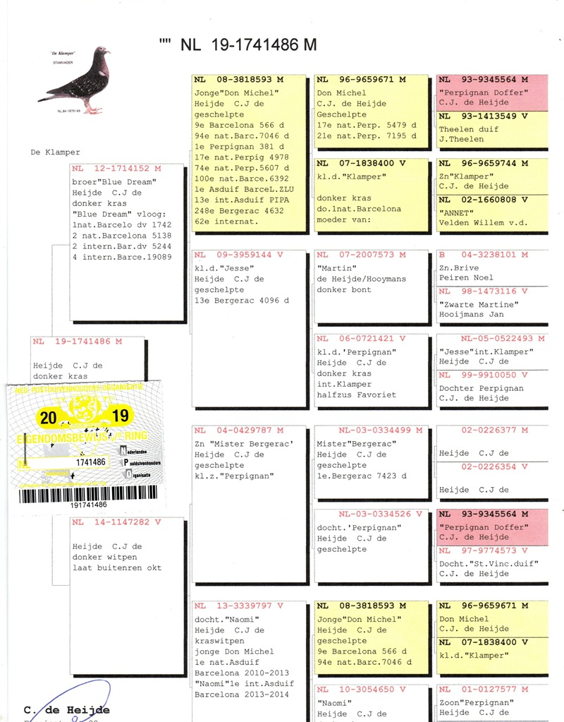 Over the years, his loft has hosted pigeons from some of the greatest marathon masters in Europe: Etienne Meirlaen, Wim Muller, Cor de Heijde, Kipp & Söhne, Jelle Jellema, Rex de Leuw, as well as originals from Andreeas Drapa, G. van Tuyl, Benno Kastelein, Gero Dijk, and Ronald Geerdink (100% Cor de Heijde). This careful selection has consolidated a strong genetic line, designed to deliver top performances in marathon, speed, middle-distance, and general categories.