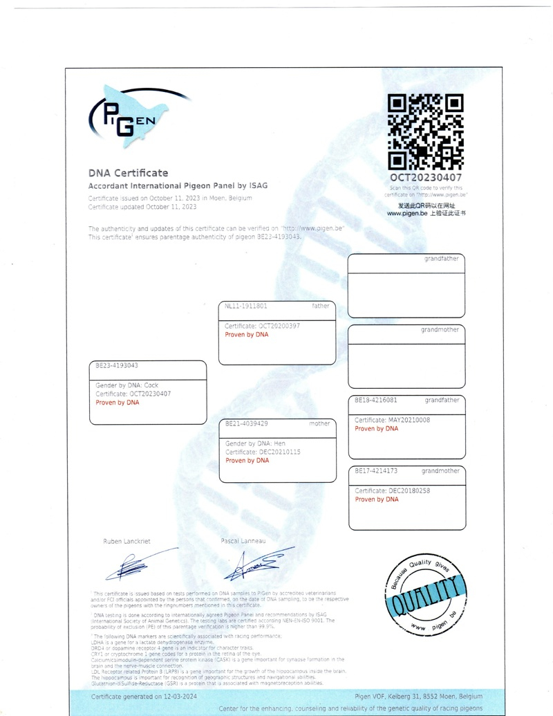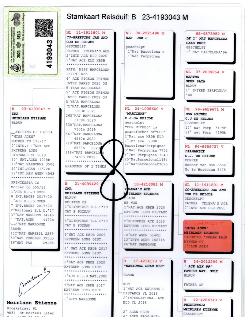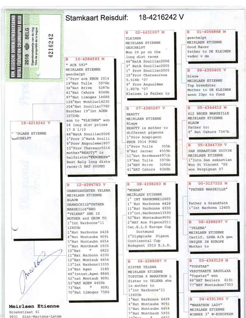 Over the years, his loft has hosted pigeons from some of the greatest marathon masters in Europe: Etienne Meirlaen, Wim Muller, Cor de Heijde, Kipp & Söhne, Jelle Jellema, Rex de Leuw, as well as originals from Andreeas Drapa, G. van Tuyl, Benno Kastelein, Gero Dijk, and Ronald Geerdink (100% Cor de Heijde). This careful selection has consolidated a strong genetic line, designed to deliver top performances in marathon, speed, middle-distance, and general categories.