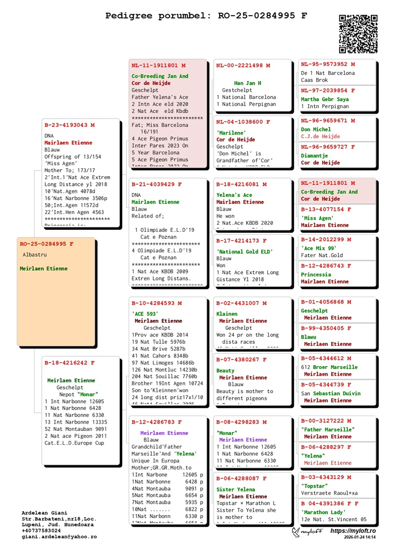 Currently, Mr. Ardelean is offering for sale a group of 12 pigeons with elite origins, destined to carry forward the tradition of success. The results achieved by fanciers who have introduced these pigeons into their lofts confirm their genetic value:
