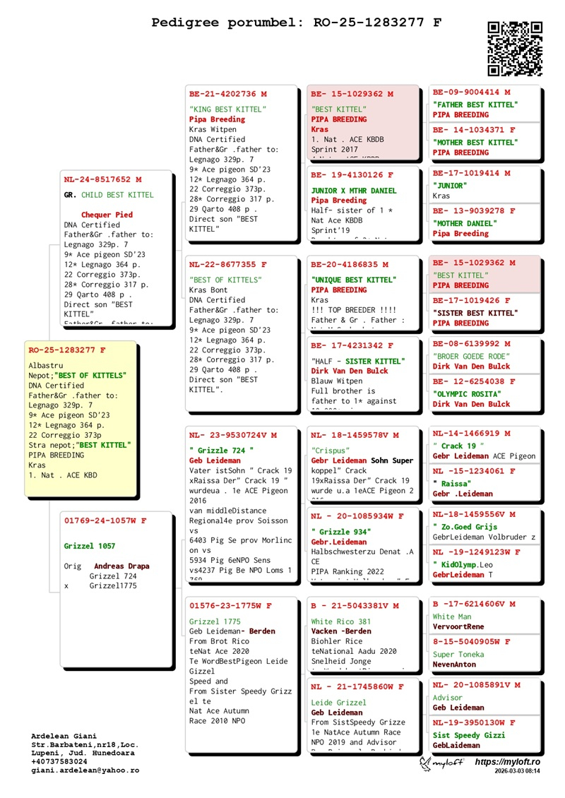 Currently, Mr. Ardelean is offering for sale a group of 12 pigeons with elite origins, destined to carry forward the tradition of success. The results achieved by fanciers who have introduced these pigeons into their lofts confirm their genetic value: