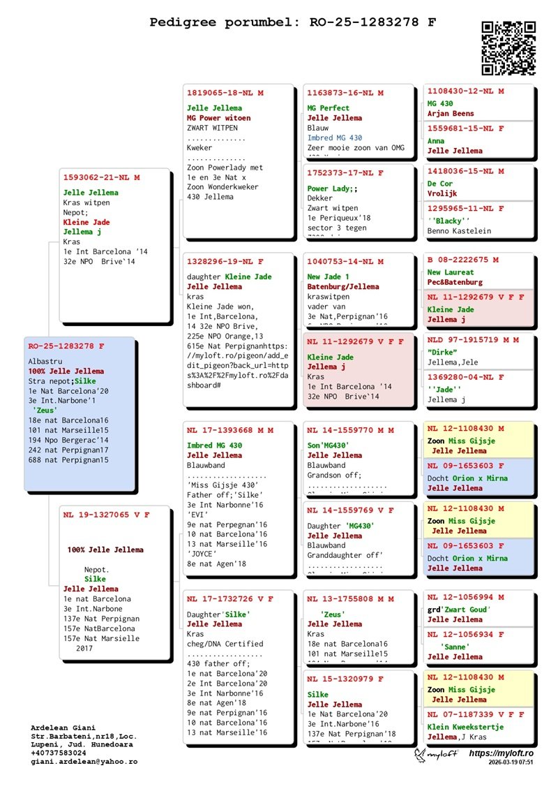 Currently, Mr. Ardelean is offering for sale a group of 12 pigeons with elite origins, destined to carry forward the tradition of success. The results achieved by fanciers who have introduced these pigeons into their lofts confirm their genetic value: