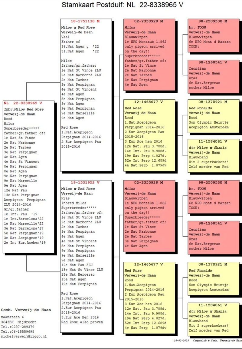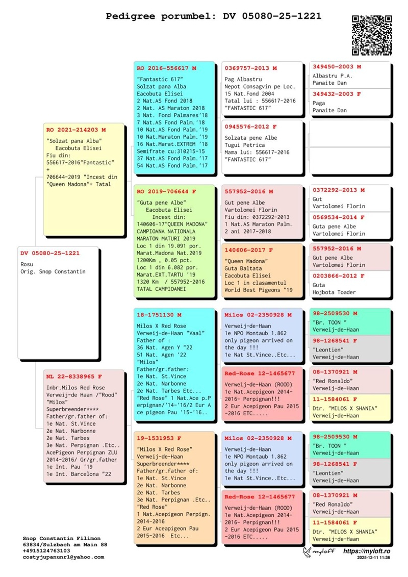 The loft consists exclusively of pigeons descending from proven, well-established bloodlines, tested both nationally and internationally, acquired from top fanciers in Romania and Western Europe, such as Fratii Tătaru, Bogdan Sorin, Cristi Stan, Eacobuta Elisei, Rans Jeroen & Stijn, Comb. Werweij–de Haan, Boian & Panescu Tavi. These pigeons have consistently demonstrated exceptional endurance and performance in races of 800–1000 km, often under challenging conditions.