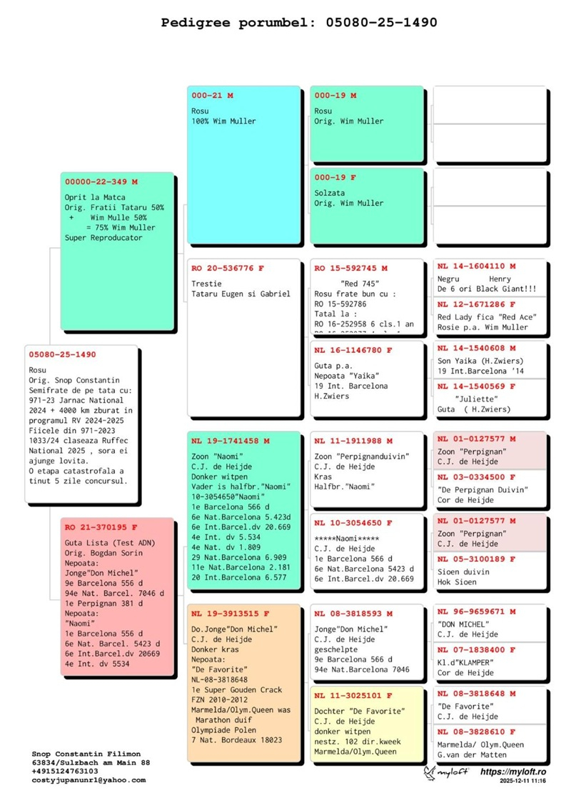 The loft consists exclusively of pigeons descending from proven, well-established bloodlines, tested both nationally and internationally, acquired from top fanciers in Romania and Western Europe, such as Fratii Tătaru, Bogdan Sorin, Cristi Stan, Eacobuta Elisei, Rans Jeroen & Stijn, Comb. Werweij–de Haan, Boian & Panescu Tavi. These pigeons have consistently demonstrated exceptional endurance and performance in races of 800–1000 km, often under challenging conditions.