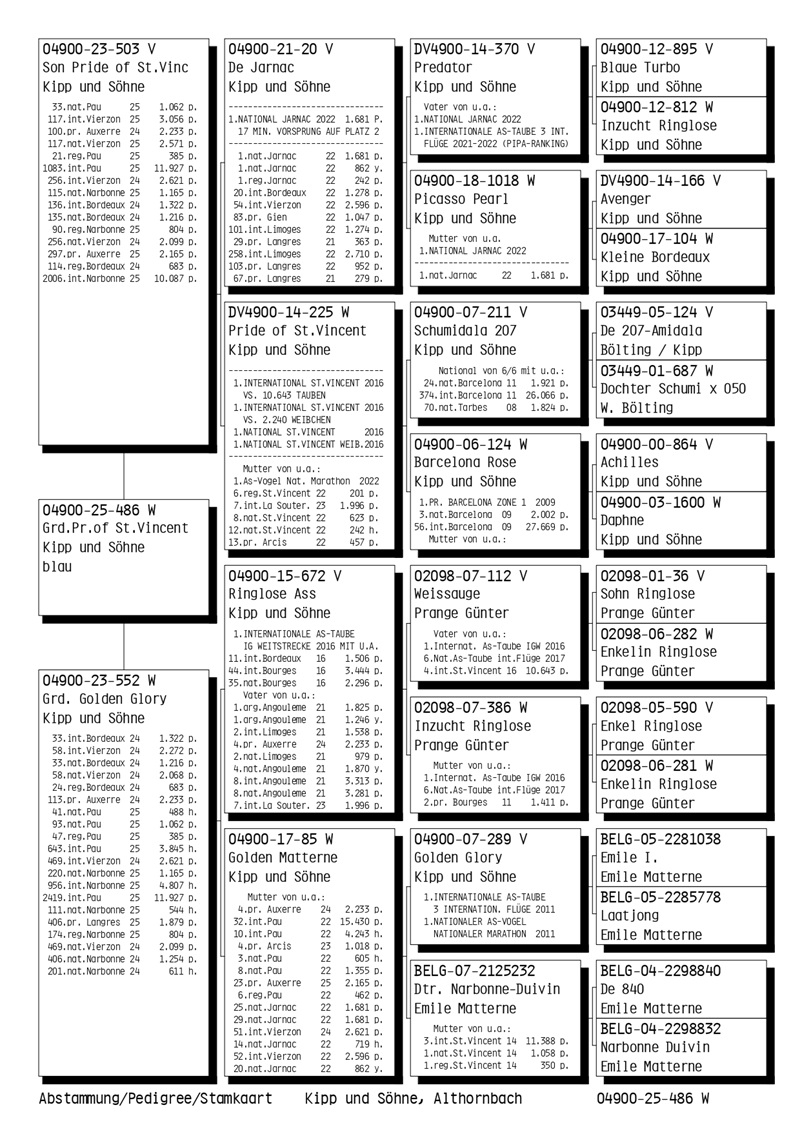 The Kipp family is offering an impeccable lot of young pigeons, many of whom are direct descendants of their national and international champions. This exclusive auction represents a rare opportunity for marathon enthusiasts. The pigeons in this lot reflect the Kipp family’s tradition of excellence and are guaranteed to deliver top performances.