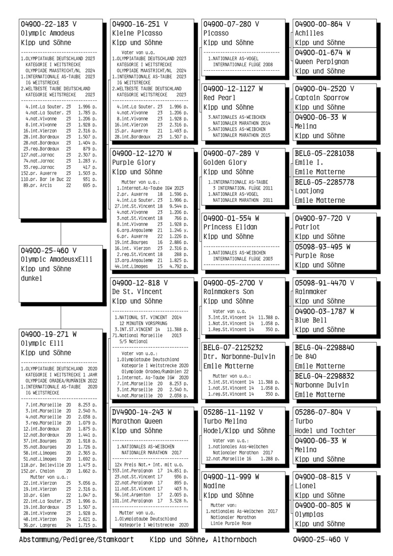 The Kipp family is offering an impeccable lot of young pigeons, many of whom are direct descendants of their national and international champions. This exclusive auction represents a rare opportunity for marathon enthusiasts. The pigeons in this lot reflect the Kipp family’s tradition of excellence and are guaranteed to deliver top performances.