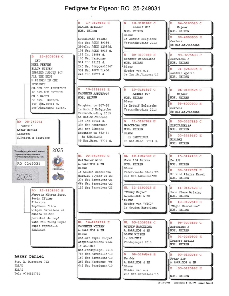In recent years, Daniel Lazăr has consistently and strategically invested in elite genetic material, originating from some of the most renowned marathon families in Europe. Among these are Jelle Jellema, a global benchmark for long-distance endurance races; Ko Van Dommelen, known for his exceptionally resilient pigeons capable of performing under extreme weather conditions; Bungeneers, a line distinguished by balance and consistency in long-distance and marathon races; Saarlos, with birds marked by sustained speed and strong determination over long stages; as well as N. Peiren and N. Paesen, leading Belgian breeders valued for the steadiness of their marathon pigeons and for descendants that continue to prove themselves across numerous European lofts.