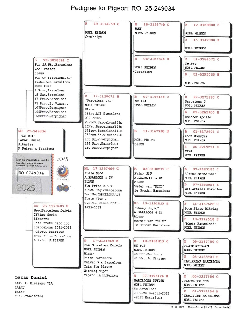 In recent years, Daniel Lazăr has consistently and strategically invested in elite genetic material, originating from some of the most renowned marathon families in Europe. Among these are Jelle Jellema, a global benchmark for long-distance endurance races; Ko Van Dommelen, known for his exceptionally resilient pigeons capable of performing under extreme weather conditions; Bungeneers, a line distinguished by balance and consistency in long-distance and marathon races; Saarlos, with birds marked by sustained speed and strong determination over long stages; as well as N. Peiren and N. Paesen, leading Belgian breeders valued for the steadiness of their marathon pigeons and for descendants that continue to prove themselves across numerous European lofts.