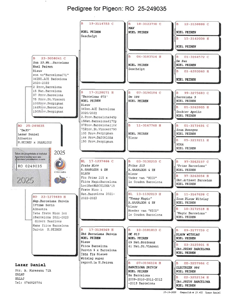 In recent years, Daniel Lazăr has consistently and strategically invested in elite genetic material, originating from some of the most renowned marathon families in Europe. Among these are Jelle Jellema, a global benchmark for long-distance endurance races; Ko Van Dommelen, known for his exceptionally resilient pigeons capable of performing under extreme weather conditions; Bungeneers, a line distinguished by balance and consistency in long-distance and marathon races; Saarlos, with birds marked by sustained speed and strong determination over long stages; as well as N. Peiren and N. Paesen, leading Belgian breeders valued for the steadiness of their marathon pigeons and for descendants that continue to prove themselves across numerous European lofts.