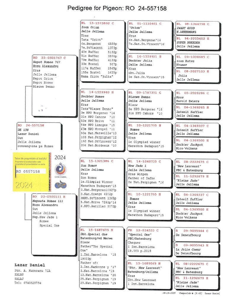 Regarding his future vision, Lazăr Daniel aims to consolidate several foundational families within his loft, built around those males and females that have shown not only individual performances but consistent results over multiple marathon seasons. His breeding philosophy is centered on durability, character, and the transmission of genetic value, rather than on fleeting successes. His ultimate goal is to create an ideal type of marathon pigeon — balanced, intelligent, resilient, and with an exceptional capacity for recovery — the product of rigorous selection and a harmonious blend of the Jellema, Ko Van Dommelen, Bungeneers, Saarlos, N. Peiren, and N. Paesen bloodlines.