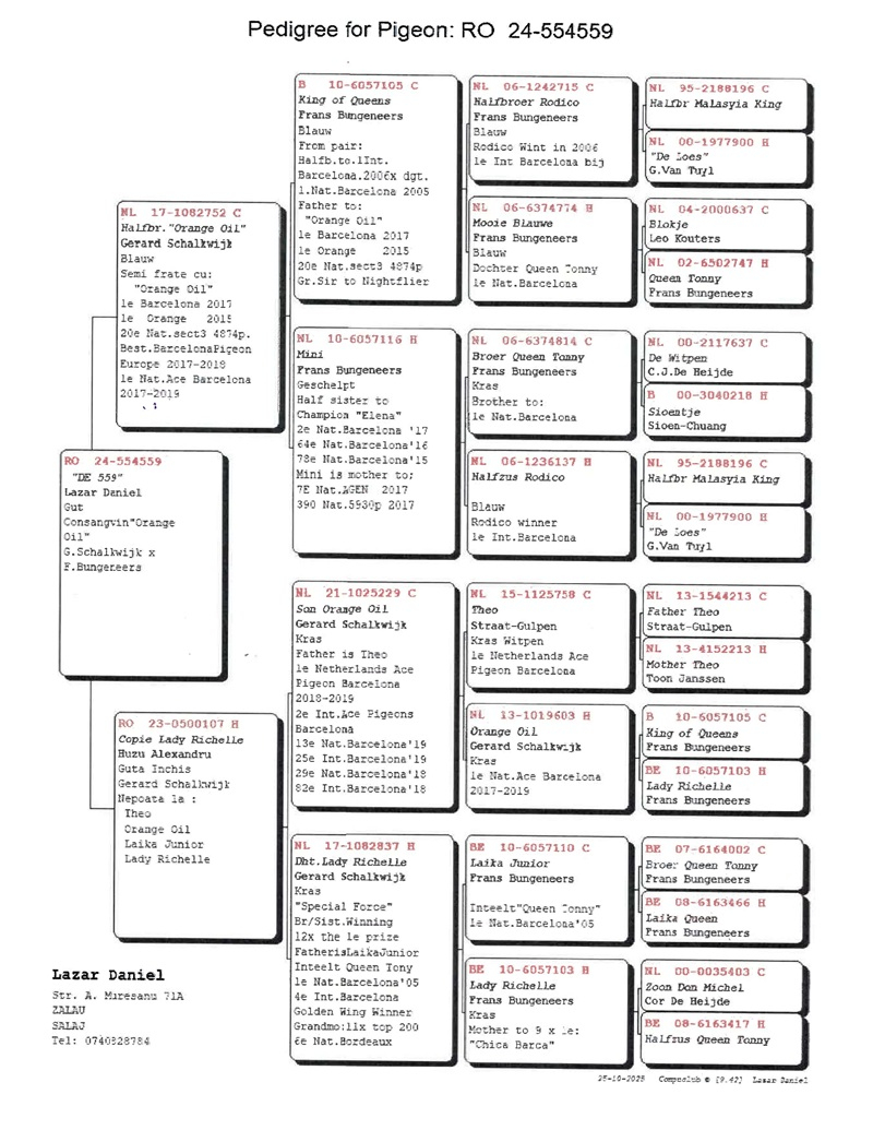 In recent years, Daniel Lazăr has consistently and strategically invested in elite genetic material, originating from some of the most renowned marathon families in Europe. Among these are Jelle Jellema, a global benchmark for long-distance endurance races; Ko Van Dommelen, known for his exceptionally resilient pigeons capable of performing under extreme weather conditions; Bungeneers, a line distinguished by balance and consistency in long-distance and marathon races; Saarlos, with birds marked by sustained speed and strong determination over long stages; as well as N. Peiren and N. Paesen, leading Belgian breeders valued for the steadiness of their marathon pigeons and for descendants that continue to prove themselves across numerous European lofts.