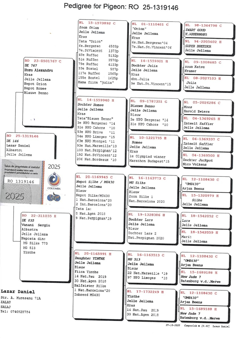 In recent years, Daniel Lazăr has consistently and strategically invested in elite genetic material, originating from some of the most renowned marathon families in Europe. Among these are Jelle Jellema, a global benchmark for long-distance endurance races; Ko Van Dommelen, known for his exceptionally resilient pigeons capable of performing under extreme weather conditions; Bungeneers, a line distinguished by balance and consistency in long-distance and marathon races; Saarlos, with birds marked by sustained speed and strong determination over long stages; as well as N. Peiren and N. Paesen, leading Belgian breeders valued for the steadiness of their marathon pigeons and for descendants that continue to prove themselves across numerous European lofts.
