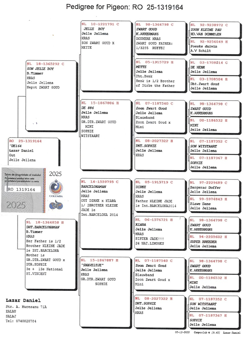 In recent years, Daniel Lazăr has consistently and strategically invested in elite genetic material, originating from some of the most renowned marathon families in Europe. Among these are Jelle Jellema, a global benchmark for long-distance endurance races; Ko Van Dommelen, known for his exceptionally resilient pigeons capable of performing under extreme weather conditions; Bungeneers, a line distinguished by balance and consistency in long-distance and marathon races; Saarlos, with birds marked by sustained speed and strong determination over long stages; as well as N. Peiren and N. Paesen, leading Belgian breeders valued for the steadiness of their marathon pigeons and for descendants that continue to prove themselves across numerous European lofts.