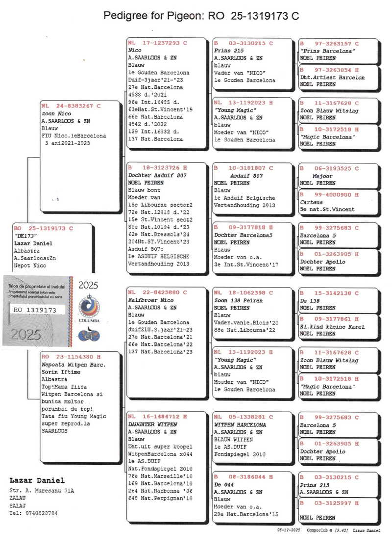 In recent years, Daniel Lazăr has consistently and strategically invested in elite genetic material, originating from some of the most renowned marathon families in Europe. Among these are Jelle Jellema, a global benchmark for long-distance endurance races; Ko Van Dommelen, known for his exceptionally resilient pigeons capable of performing under extreme weather conditions; Bungeneers, a line distinguished by balance and consistency in long-distance and marathon races; Saarlos, with birds marked by sustained speed and strong determination over long stages; as well as N. Peiren and N. Paesen, leading Belgian breeders valued for the steadiness of their marathon pigeons and for descendants that continue to prove themselves across numerous European lofts.
