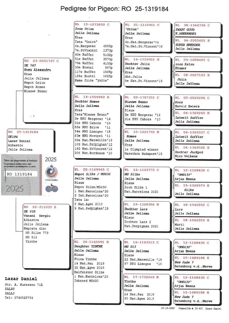 In recent years, Daniel Lazăr has consistently and strategically invested in elite genetic material, originating from some of the most renowned marathon families in Europe. Among these are Jelle Jellema, a global benchmark for long-distance endurance races; Ko Van Dommelen, known for his exceptionally resilient pigeons capable of performing under extreme weather conditions; Bungeneers, a line distinguished by balance and consistency in long-distance and marathon races; Saarlos, with birds marked by sustained speed and strong determination over long stages; as well as N. Peiren and N. Paesen, leading Belgian breeders valued for the steadiness of their marathon pigeons and for descendants that continue to prove themselves across numerous European lofts.