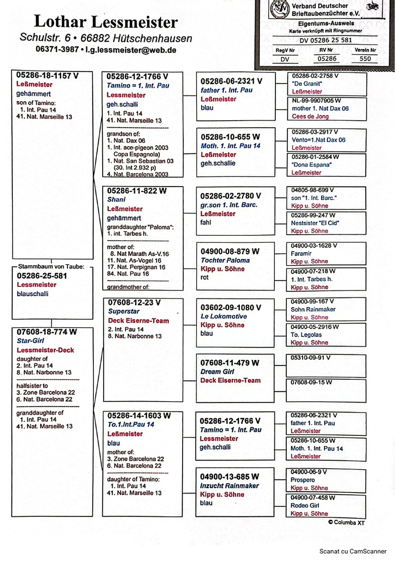 Through his website, Lothar Lessmeister offers Romanian long-distance enthusiasts a selection of young pigeons with exceptional marathon origins. More information about his loft can be found on his official website: https://lotharlessmeister.de.tl/.