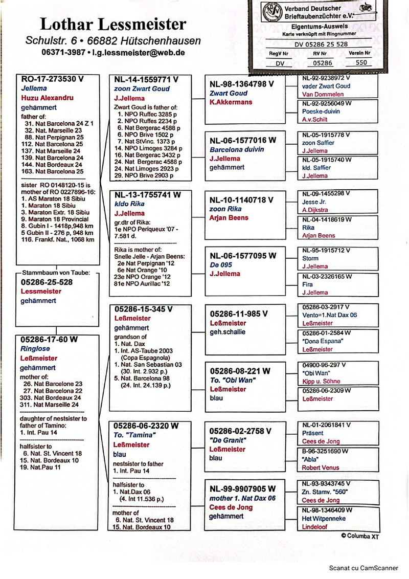 Through his website, Lothar Lessmeister offers Romanian long-distance enthusiasts a selection of young pigeons with exceptional marathon origins. More information about his loft can be found on his official website: https://lotharlessmeister.de.tl/.