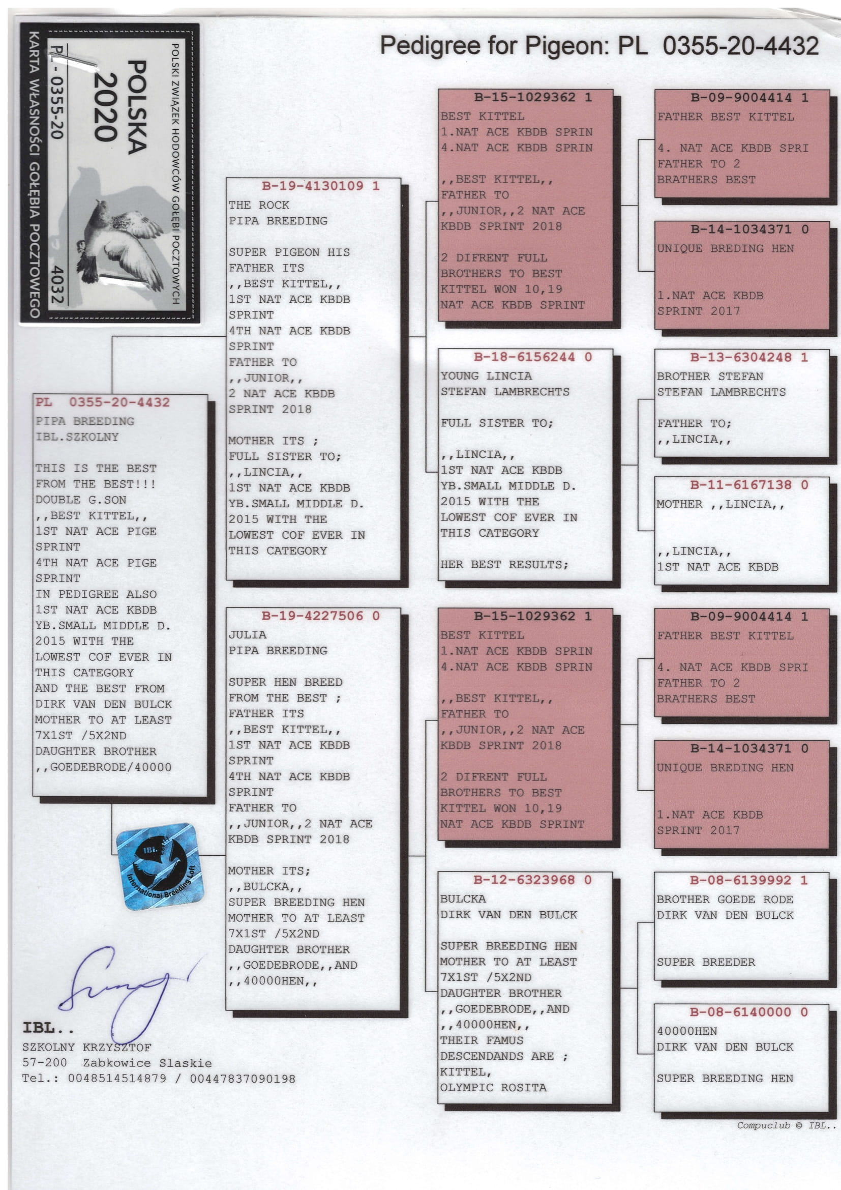 • 1st place in Hot Spot 115 km and 1st place in the Derby Extra Final 500 km, with the same pigeon;