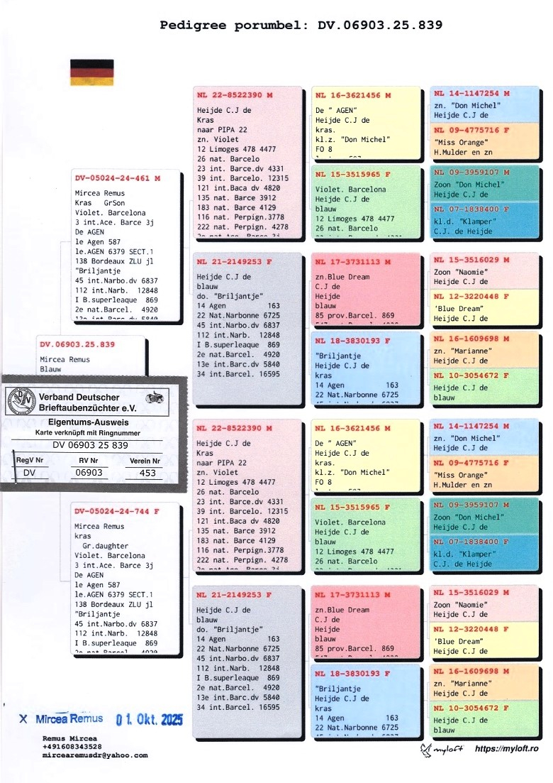 The selection of birds has been carried out with utmost precision, each specimen being chosen for its valuable pedigree and exceptional race record. Among these outstanding bloodlines are descendants of legendary pigeons such as “Jonge Don Michel”, “Marianne”, “Diamantje”, “Smaragd”, “Milos”, “Miss Milos” and “de Kleine Blauwe”. Together, these pigeons form one of the most solid breeding foundations ever established by a Romanian fancier abroad.