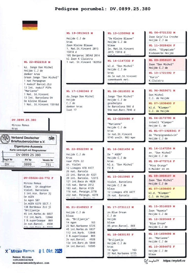 The selection of birds has been carried out with utmost precision, each specimen being chosen for its valuable pedigree and exceptional race record. Among these outstanding bloodlines are descendants of legendary pigeons such as “Jonge Don Michel”, “Marianne”, “Diamantje”, “Smaragd”, “Milos”, “Miss Milos” and “de Kleine Blauwe”. Together, these pigeons form one of the most solid breeding foundations ever established by a Romanian fancier abroad.