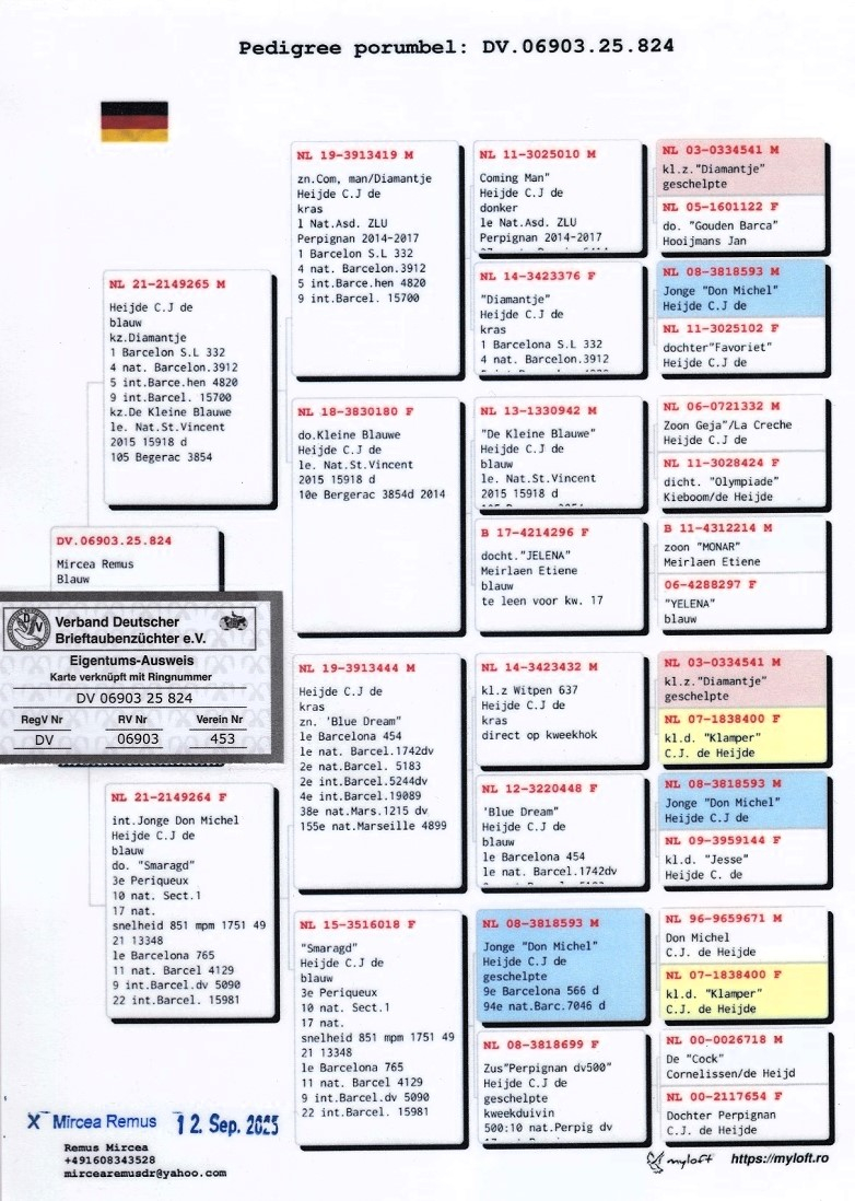 The selection of birds has been carried out with utmost precision, each specimen being chosen for its valuable pedigree and exceptional race record. Among these outstanding bloodlines are descendants of legendary pigeons such as “Jonge Don Michel”, “Marianne”, “Diamantje”, “Smaragd”, “Milos”, “Miss Milos” and “de Kleine Blauwe”. Together, these pigeons form one of the most solid breeding foundations ever established by a Romanian fancier abroad.