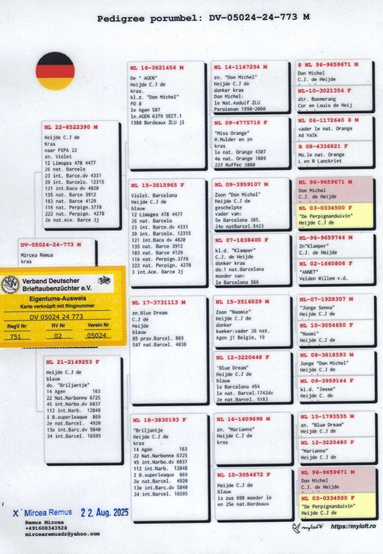 The selection of birds has been carried out with utmost precision, each specimen being chosen for its valuable pedigree and exceptional race record. Among these outstanding bloodlines are descendants of legendary pigeons such as “Jonge Don Michel”, “Marianne”, “Diamantje”, “Smaragd”, “Milos”, “Miss Milos” and “de Kleine Blauwe”. Together, these pigeons form one of the most solid breeding foundations ever established by a Romanian fancier abroad.