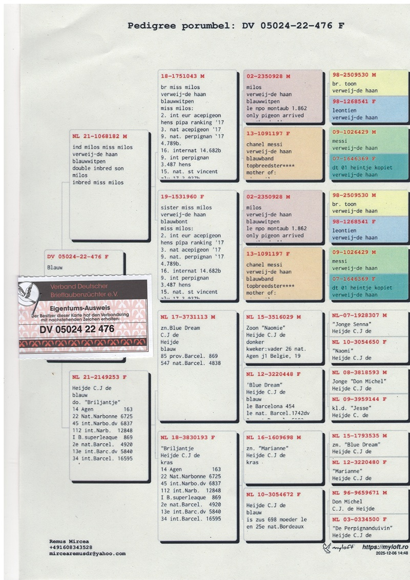 The selection of birds has been carried out with utmost precision, each specimen being chosen for its valuable pedigree and exceptional race record. Among these outstanding bloodlines are descendants of legendary pigeons such as “Jonge Don Michel”“Marianne”“Diamantje”“Smaragd”“Milos”“Miss Milos” and “de Kleine Blauwe”. Together, these pigeons form one of the most solid breeding foundations ever established by a Romanian fancier abroad.