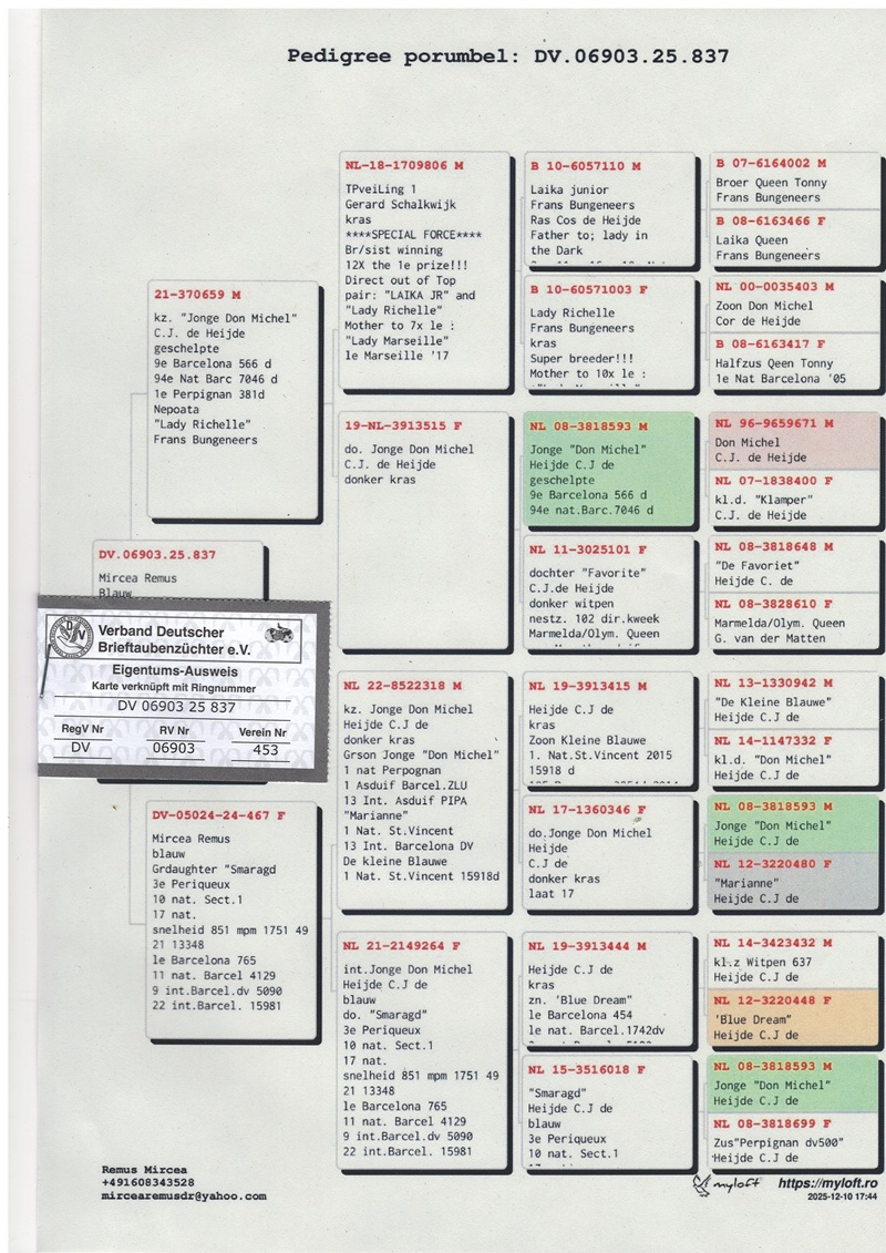 The selection of birds has been carried out with utmost precision, each specimen being chosen for its valuable pedigree and exceptional race record. Among these outstanding bloodlines are descendants of legendary pigeons such as “Jonge Don Michel”“Marianne”“Diamantje”“Smaragd”“Milos”“Miss Milos” and “de Kleine Blauwe”. Together, these pigeons form one of the most solid breeding foundations ever established by a Romanian fancier abroad.