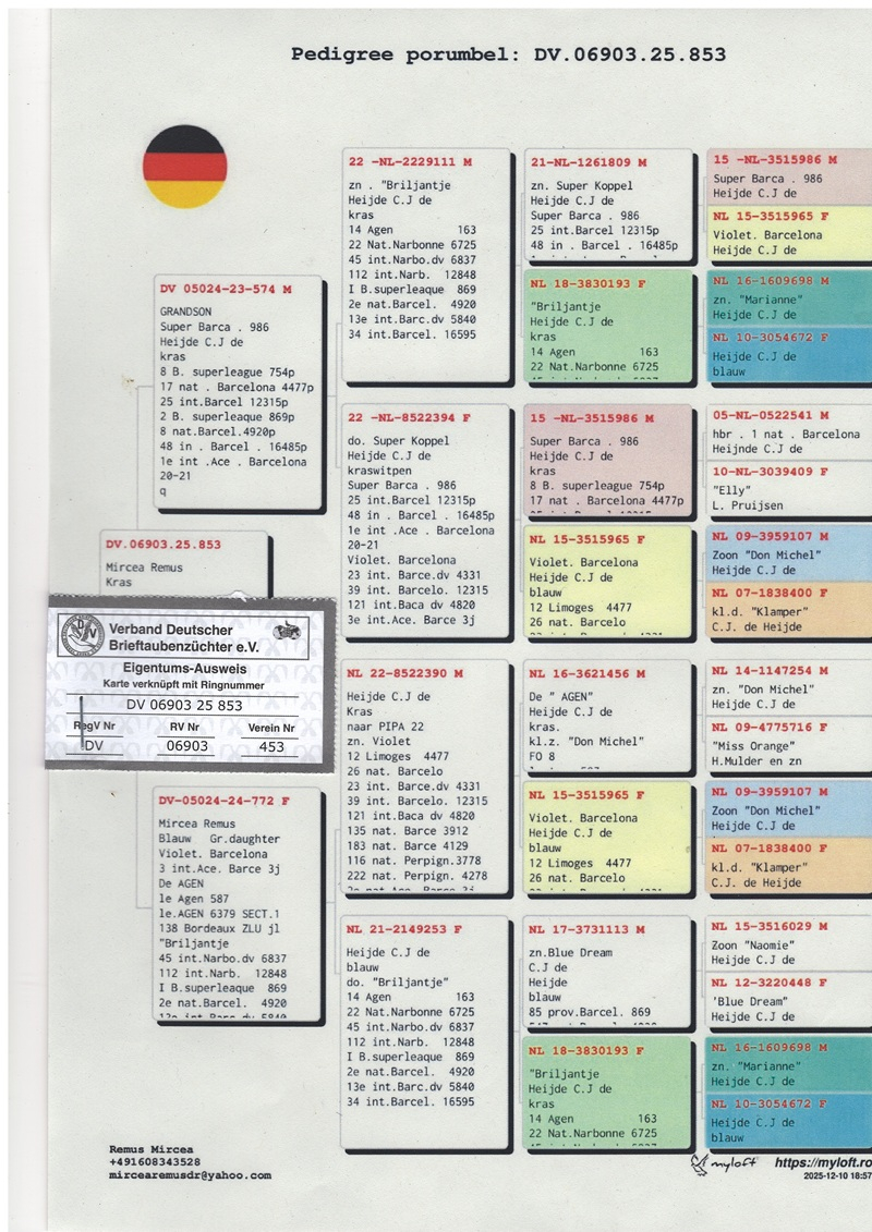 The selection of birds has been carried out with utmost precision, each specimen being chosen for its valuable pedigree and exceptional race record. Among these outstanding bloodlines are descendants of legendary pigeons such as “Jonge Don Michel”“Marianne”“Diamantje”“Smaragd”“Milos”“Miss Milos” and “de Kleine Blauwe”. Together, these pigeons form one of the most solid breeding foundations ever established by a Romanian fancier abroad.