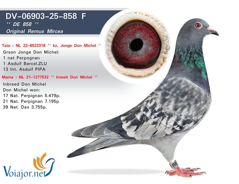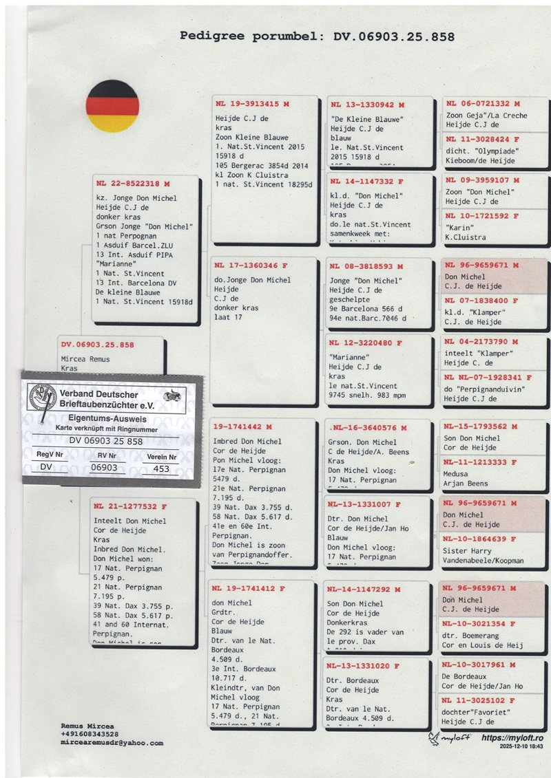 The selection of birds has been carried out with utmost precision, each specimen being chosen for its valuable pedigree and exceptional race record. Among these outstanding bloodlines are descendants of legendary pigeons such as “Jonge Don Michel”“Marianne”“Diamantje”“Smaragd”“Milos”“Miss Milos” and “de Kleine Blauwe”. Together, these pigeons form one of the most solid breeding foundations ever established by a Romanian fancier abroad.