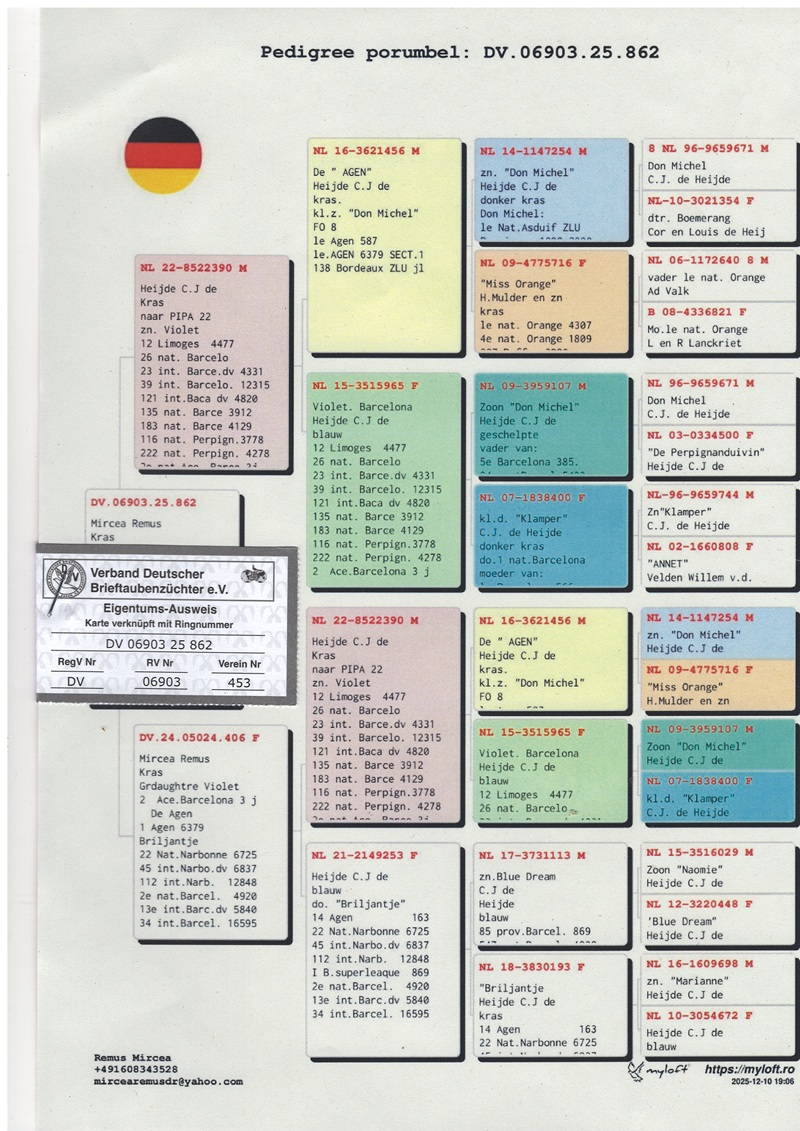 The selection of birds has been carried out with utmost precision, each specimen being chosen for its valuable pedigree and exceptional race record. Among these outstanding bloodlines are descendants of legendary pigeons such as “Jonge Don Michel”“Marianne”“Diamantje”“Smaragd”“Milos”“Miss Milos” and “de Kleine Blauwe”. Together, these pigeons form one of the most solid breeding foundations ever established by a Romanian fancier abroad.