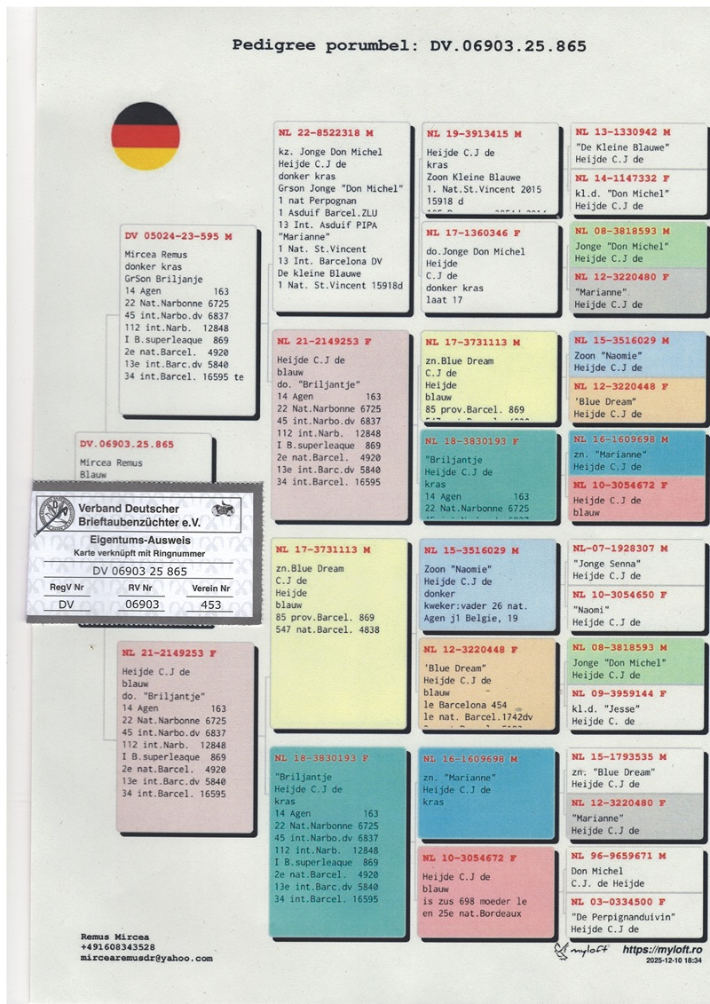 The selection of birds has been carried out with utmost precision, each specimen being chosen for its valuable pedigree and exceptional race record. Among these outstanding bloodlines are descendants of legendary pigeons such as “Jonge Don Michel”, “Marianne”, “Diamantje”, “Smaragd”, “Milos”, “Miss Milos” and “de Kleine Blauwe”. Together, these pigeons form one of the most solid breeding foundations ever established by a Romanian fancier abroad.