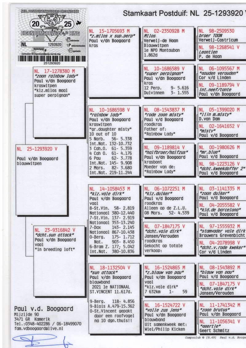 Over the years, Paul has patiently and strategically built an outstanding strain of racing pigeons based on pure quality and proven performance. Among the most important foundation pigeons in his loft are the legendary Brutus and Misty, two top-class breeders that have significantly strengthened the overall genetic power of the colony. In all key pigeons, one will consistently find the influence of Breeding Pair 1 and Breeding Pair 2, the true pillars of this elite line. Through carefully selected introductions of new blood, Paul has always managed to give his colony fresh impulses while preserving its genetic identity.