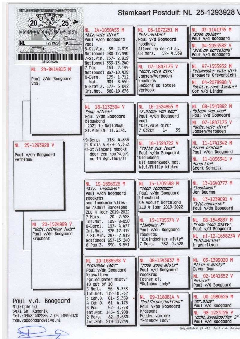 Over the years, Paul has patiently and strategically built an outstanding strain of racing pigeons based on pure quality and proven performance. Among the most important foundation pigeons in his loft are the legendary Brutus and Misty, two top-class breeders that have significantly strengthened the overall genetic power of the colony. In all key pigeons, one will consistently find the influence of Breeding Pair 1 and Breeding Pair 2, the true pillars of this elite line. Through carefully selected introductions of new blood, Paul has always managed to give his colony fresh impulses while preserving its genetic identity.