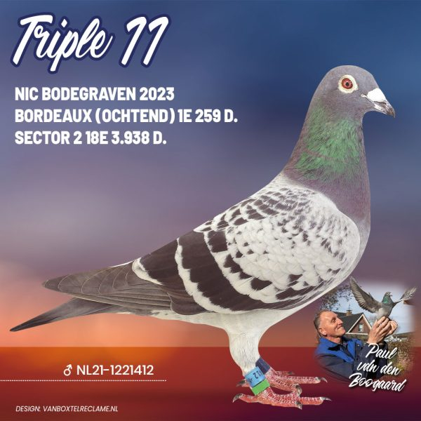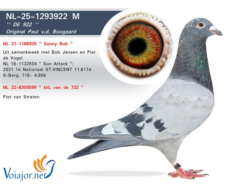 Another outstanding name is Sun Attack, winner of 1st National St. Vincent 2021, clocking as the fastest of 11,617 pigeons. Sun Attack also carries the famous bloodlines of Pair 1 and Pair 2. His grandfather is Blauw van Pau, who is therefore also the grandfather of SuperBob. The mother of Sun Attack was bred from Zoon Brutus x Geertje, a joint breeding project by Wiel and Philip Kicken.
