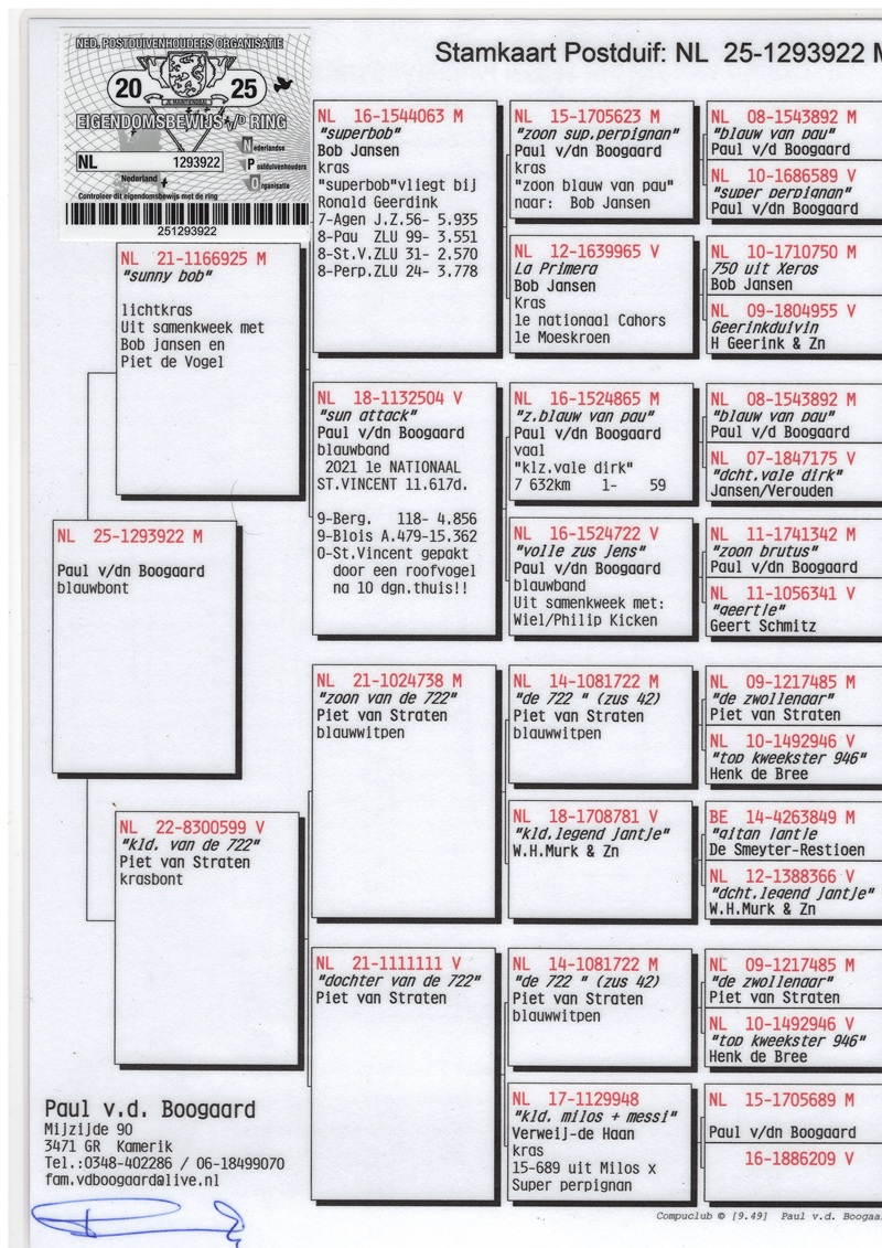 Over the years, Paul has patiently and strategically built an outstanding strain of racing pigeons based on pure quality and proven performance. Among the most important foundation pigeons in his loft are the legendary Brutus and Misty, two top-class breeders that have significantly strengthened the overall genetic power of the colony. In all key pigeons, one will consistently find the influence of Breeding Pair 1 and Breeding Pair 2, the true pillars of this elite line. Through carefully selected introductions of new blood, Paul has always managed to give his colony fresh impulses while preserving its genetic identity.