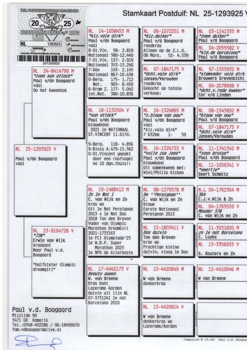 Paul owns pigeons of the very highest quality for extreme long-distance racing, where strength, endurance, and mental toughness are decisive. Experience has shown that the stronger, heavier pigeons often succeed in finishing at the very top. Nevertheless, his strain – built around Breeding Pair 1 and Pair 2 – proves to be highly versatile, performing outstandingly well at afternoon releases, morning releases, and even at the legendary Barcelona race.